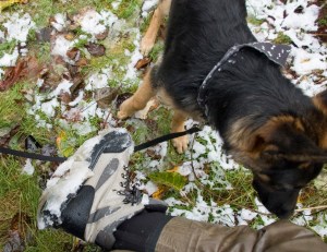 We didn’t spend as much time walking in the river channel as on the snowy grass. Within 10 steps, I had a thick accumulation of snow on my felt sole. My companion said, “Felts are the worst.”