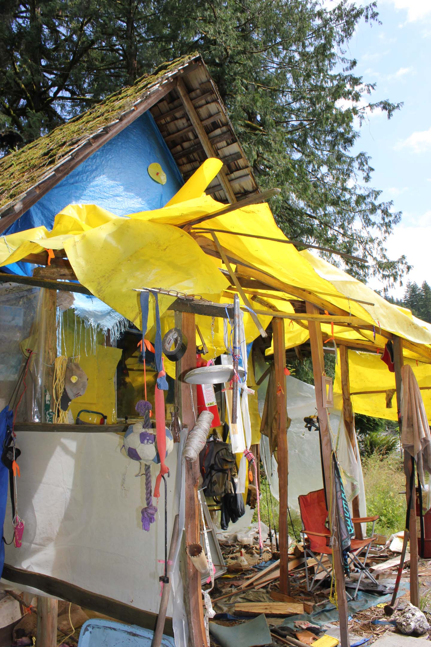 The inside was creepy. The low-ceilinged interior had a wood-burning stove and a sink (although no running water). Two beds were pushed against the corners of the room, blankets piled high. If I didn’t know that the squatter had died, I might have worried that someone was sleeping there. Laundry was still clipped to clotheslines strung from the trees. I suspect the man spent most of his time in one of his lawn chairs or hammock.