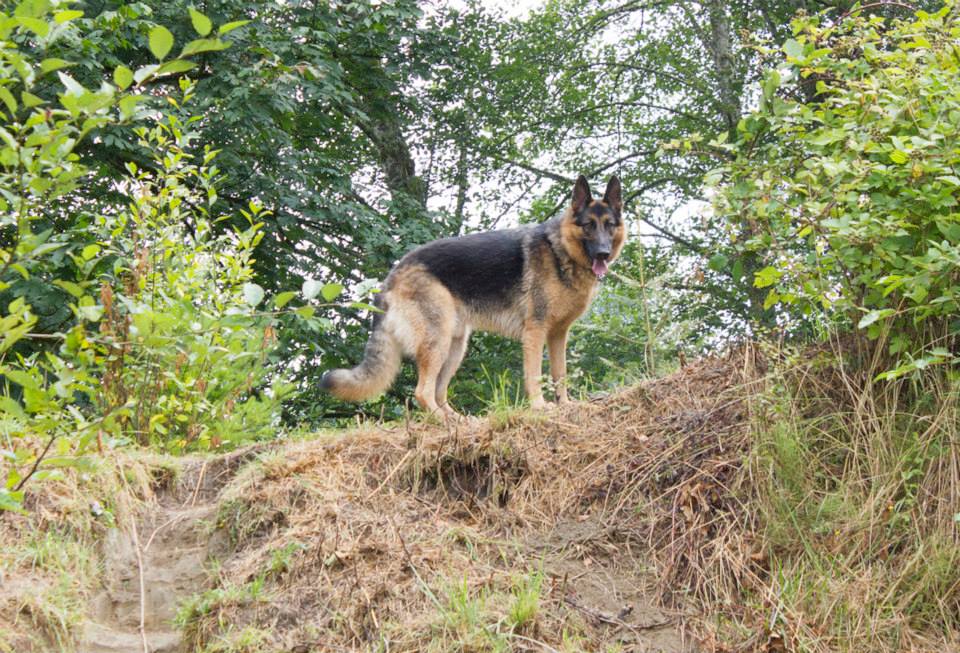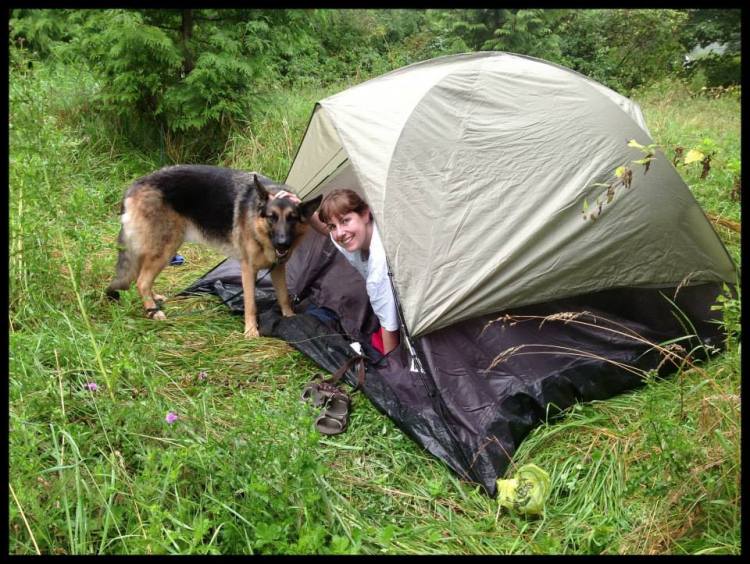 Unfortunately, someone else stole our tent spot during the day, so when Rob and the dogs arrived, we headed deeper into the woods, scratching our legs on nettles to get to a secluded spot for the four of us to snuggle into our three-person tent. We tethered Leo to a tree when he wasn’t inside our tent. Mia, of course, was allowed to wander free, since she never went far.