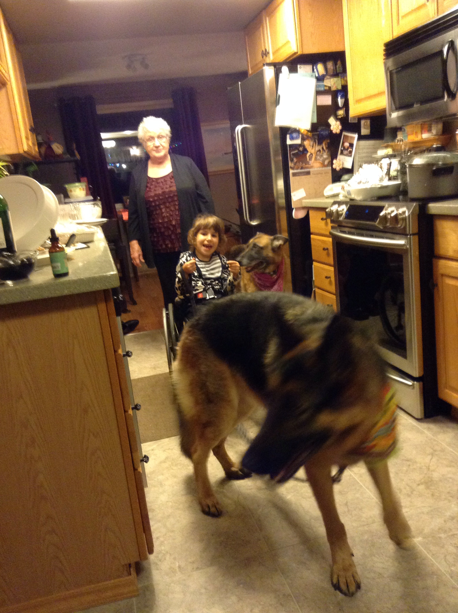 After that, I put Leo’s leash on, to keep him away from the counters and to play reindeer games. But then his leash got caught on one of the wheels of the wheelchair, so I detached him and was distracted long enough for him to snatch a wing from the turkey (now on top of the stove) and race around the house with it.
