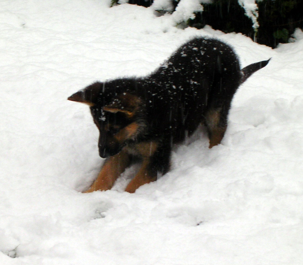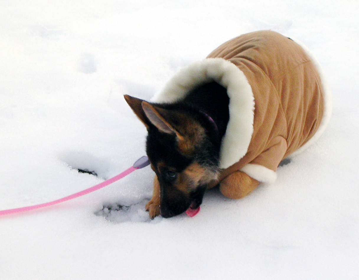 Isis’s initial steps in the snow were tentative. Where did the grass go? With just a few more steps, she decided she liked it and pounced in the snow, mouthing and play-bowing to it.