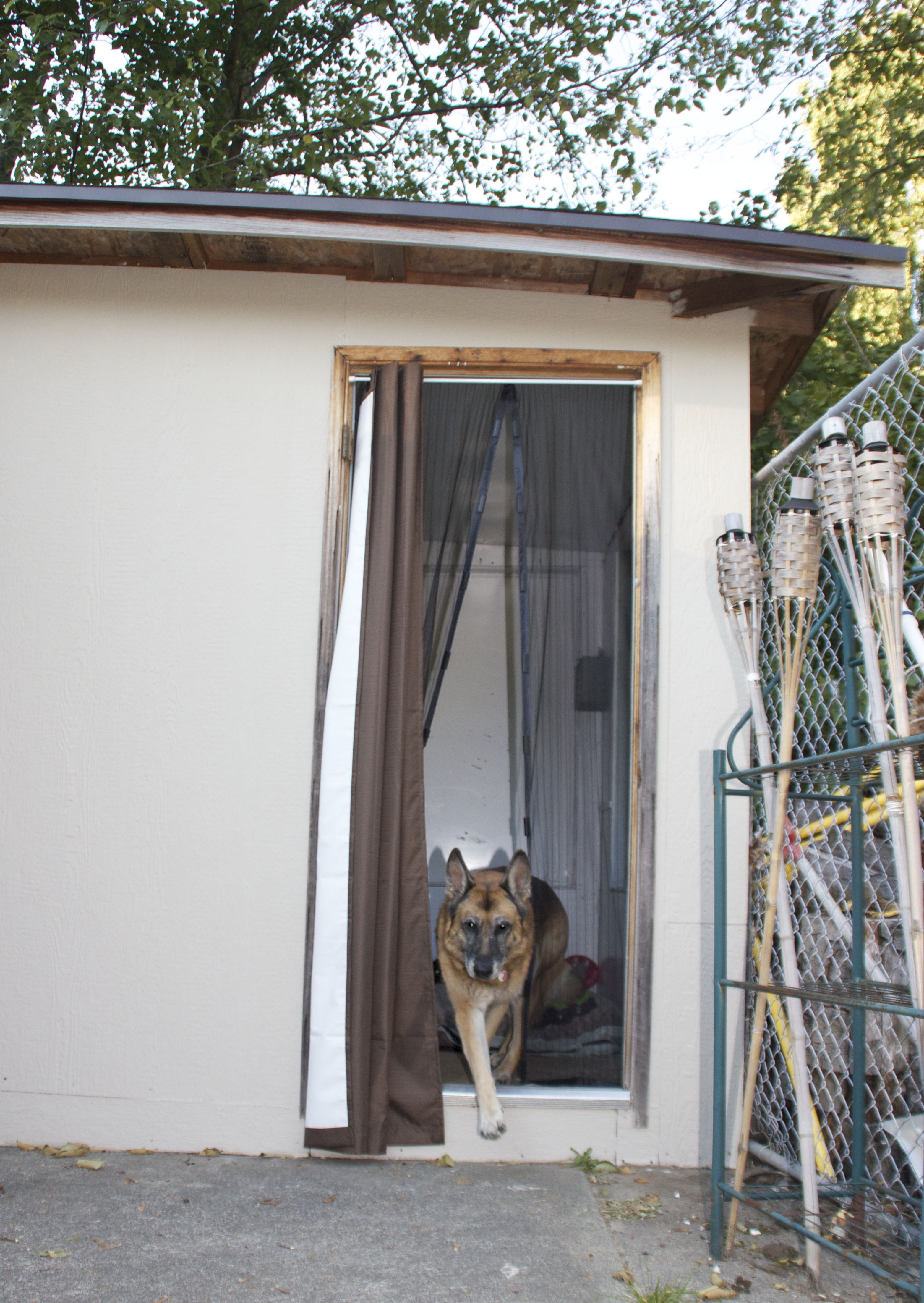 Previous Image Next Image Mia’s condo Eventually, we’ll put up a real doggie door, but this curtain works for now.