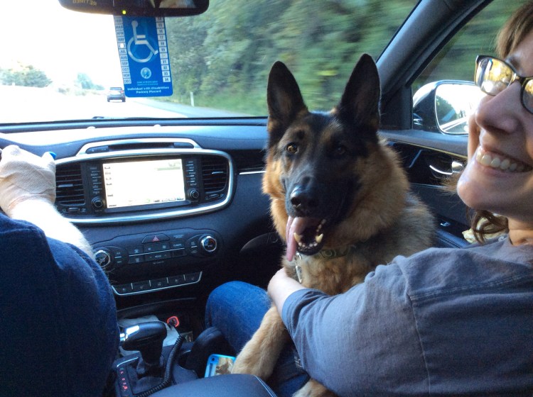 We had a full car when we dropped him off at camp. I sat in the front seat, with him on the floor at my feet. He couldn’t see anything out the window to bark at, so he didn’t need his Calming Cap.