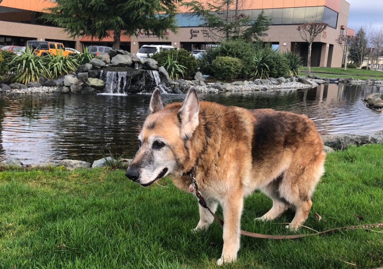 Now that’s he’s back to his old self, it’s challenging to walk both dogs together by myself. Leo wants to walk faster, and probably should for his ongoing physical therapy. I accommodate this somewhat by attaching Mia to my belt via an 8-foot leash, while Leo forges ahead on his Freedom harness with the leash attached in front and back. There’s still some tangling, and the sense that Mia is getting dragged along faster than she wants to go.